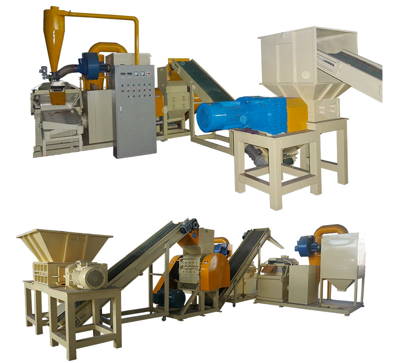 物料经上料输送机投入一级破碎机进行初级粉碎,把杂乱的废旧电缆粗切成较小尺寸,经二道皮带输送机送入二级破碎机(粉碎机),物料在二道粉碎机内被粉碎成一定尺寸(最终出料尺寸),混合的塑料皮碎片和铜米经高压风机或输送带进入气流分选系统,通过气流推动和振筛震动作用,干净的铜米和塑料皮碎片分别从不同出料口送出,设备配有小振动筛分机对物料进行二次分离,以达到不低于99%的纯净度。